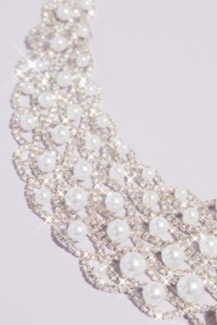 A beautiful net of sparkling crystals catches a bounty of graduated pearls atop this statement collar necklace.