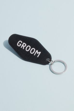 Taking inspiration from vintage hotel room keys, this key ring reads \"groom\" in a cool, crisp font.