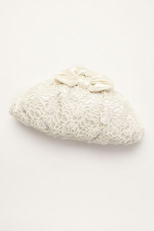 - Satin bridal pouch features intricate guipure lace pattern overlay, and is accented with a satin bow.