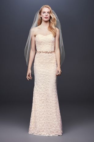 Fresh, pretty, and perfect for any wedding, this guipure lace sheath gown boasts clean lines and beautiful texture. Keep the look simple with minimal accessories, or embellish the look to your heart's desire.