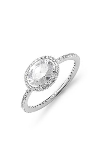 Haloed in pave cubic zirconia, this oval-cut sterling silver ring makes a sparkly statement.