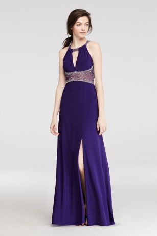 This delicately detailed prom dress will put you in the shimmering spotlight all night long! Embroidered details, an illusion waist, open back, keyhole neckline, and a sexy slit come together to create a show stopping look.