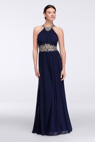 Halter Neckline Long Dress with Embroidered Waist