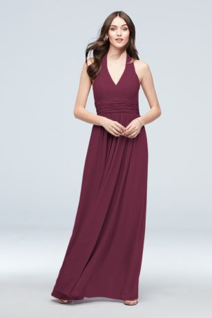 While the front of this halter georgette bridesmaid dress is stunning, it's the back that steals the show. Turn heads when you tie the adjustable, extra long halter straps into a dramatic bow.