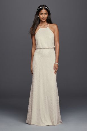 Great for that destination or beach wedding of your dreams! This blouson halter style sheath wedding dress compliments everyone with it's fun and flirty design. The all-over beaded detailing and floor length flowing skirt adds lot of feminine appeal!