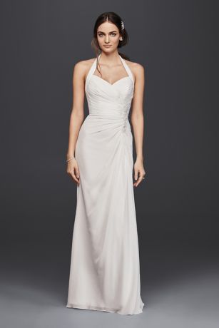 Add a little Hollywood glamour to your wedding day with this halter sheath wedding dress dress that lets everyone know it's your time to shine. Cascading chiffon and gathered side-pleating luxe up the look.