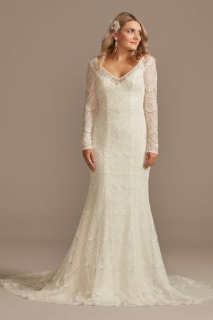 A fresh take on a timeless wedding day look, this A-line wedding dress is crafted from Chantilly lace and hand-beaded with over 2,500 beads and 20 different types of sparkling embellishments. An illusion train, plunging V-neckline, and princess seams add modern-yet-refined touches.
