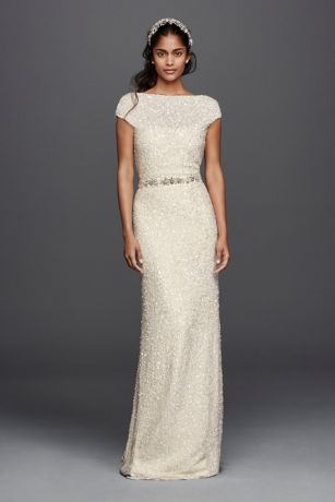 - Column skirt and all over hand beaded sequins add an elegant touch to this dress