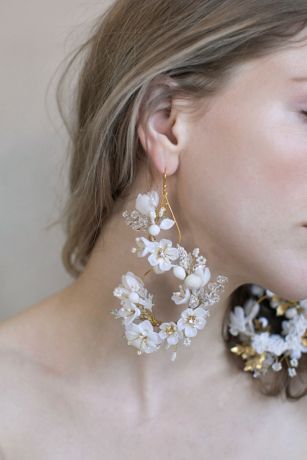 "Handmade clay flowers, vintage millinery leaves, crystal sprays, and rhinestone-encrusted leaves come together to create these unique dangly earrings.