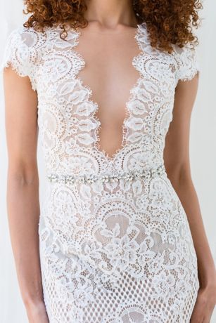 Clusters of Swarovski crystal leaves gleam from this hand-sewn sash, while a silk tie completes the look.