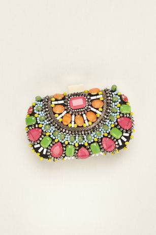 - Handbag is heavily embellished with multi-colored beading on the front and black satin on the back.