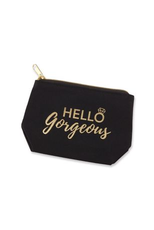 The Hello Gorgeous Canvas Makeup Bag is made from sturdy black canvas and features a gold zipper, gold foil "Hello Gorgeous," and diamond ring embellishment!