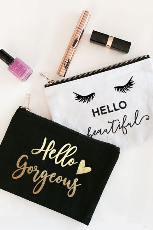 The Hello Themed Canvas Cosmetic Bags are a fun and unique touch to packaging your bridal party gifts to thank your friends or as a gift alone. Fill these makeup bags with custom lip balms, sunglasses, and more! The bags are offered in 4 different designs in either black with metallic gold foil design or white with black graphic design.