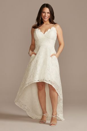 A versatile lace high-low dress, this spaghetti strap style features pretty scalloped trim at the V-neckline.