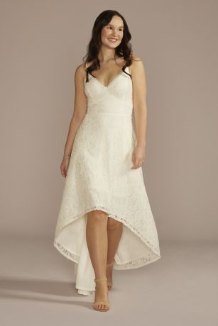An ideal choice for beach weddings or casual ceremonies, this high-low dress is crafted of allover lace and detailed with spaghetti straps and a flattering V-neckline.