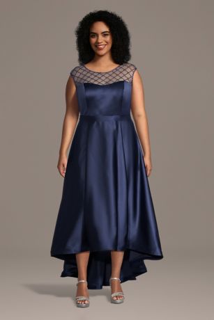 This satin tea-length dress features a high-low hem and shimmering sequin lattice detailing along the illusion neckline and back. A chic blend of classic elegance and modern sparkle for mothers of the bride and groom.