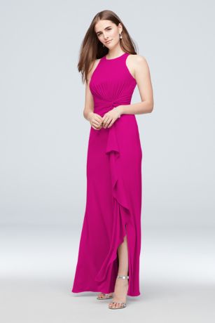 A figure-flattering pleated twist forms a cascading ruffle at the waist of this georgette bridesmaid dress. A slit skirt completes the look.