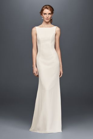 The elegantly simple front of this crepe column gown contrasts beautifully with an unexpected cascade of ruffles at the back. Twist your locks into a sleek bun to let the chic detail make a statement.