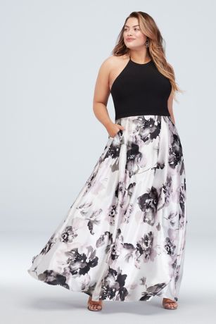 Make the prettiest entrance in this chic ball gown featuring a high-neck halter bodice and a floral print skirt (with pockets!).