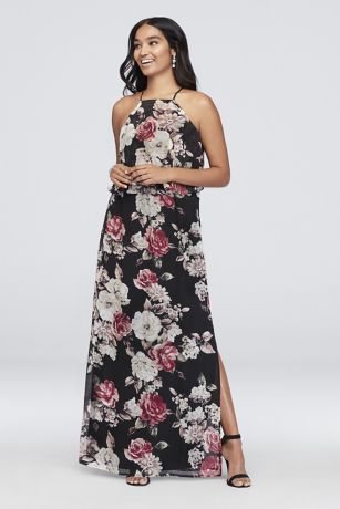 A high neckline, flounced bodice, and a bold floral print add eye-catching detail to this elegant sheath dress.