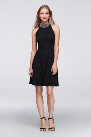 Prepare to dance the night away in this glam and glitzy dress. The jeweled halter neckline and illusion back sparkle, while the glittery textured stretch fabric adds even more brilliance.