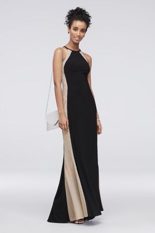 Illusion mesh side panels glimmer with metallic beads on this sexy sheath dress, while a high neck adds elegant detailing to the front.