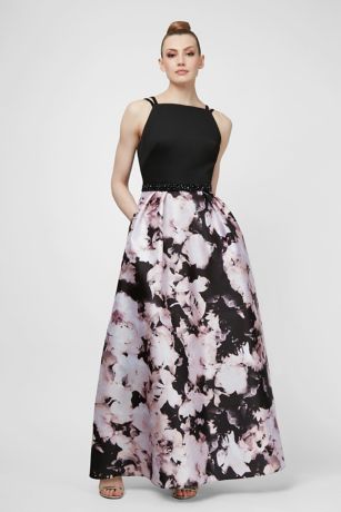 Comfort and style come together on this beautiful ball gown, featuring a stretchy-soft jersey bodice adorned with double spaghetti straps, a tonal beaded waistband, and a grand mikado ball gown skirt.