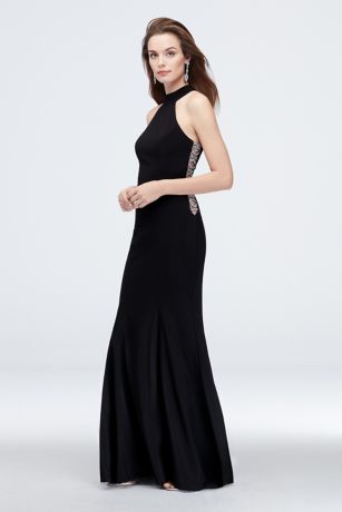High-Neck Jersey Sheath Dress with Beaded Cutouts