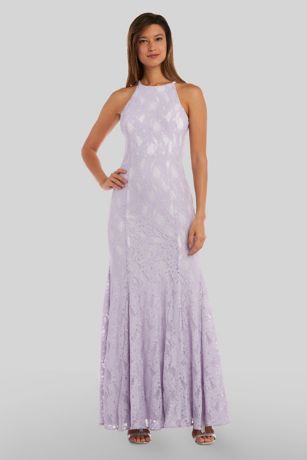 This long glitter lace mermaid gown is beautifully detailed with a high neckline and scalloped trim at the shoulders.