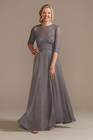 Featuring a high neckline, three-quarter sleeves, and a scalloped waist, this simply beautiful lace and chiffon A-line dress is perfect for the mother of the bride or groom who wants a little extra coverage.