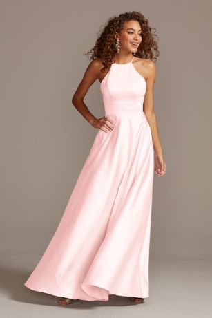 This elegant satin bridesmaid dress offers a fresh take on tradition. Luminous shine, a high neckline with crossed, adjustable spaghetti straps, and convenient side pockets enhance the classic A-line silhouette and add an element of sexy sophistication.