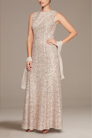 Make a statement in something that sparkles! This high neck tank fit-and-flare dress is covered in radiant sequins and comes with a sheer chiffon shawl for additional coverage.