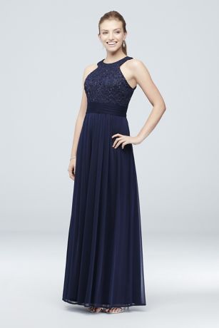 With a high neckline, a sequin lace bodice, and a flowy mesh skirt, this A-line dress flatters all figures.