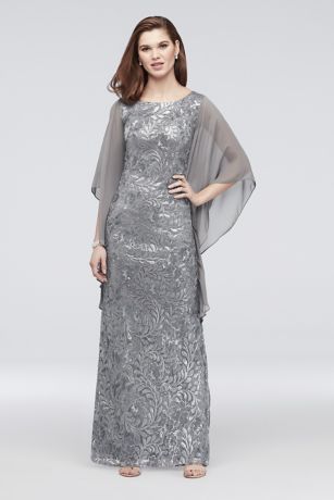 Topped with dramatic chiffon cape sleeves, and adorned with gleaming sequins, this lace sheath dress is a stunning choice for the mother of the bride or groom.