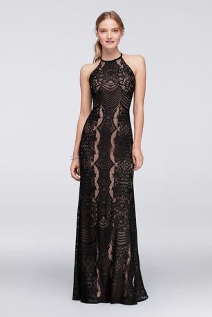 Modern lace and a keyhole back provide dramatic detail to this slim halter sheath gown.