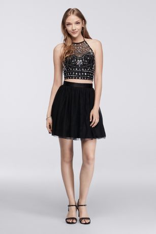 Contrasting crystals and beads swirl in a mesmerizing pattern on this two-piece homecoming set's eye-catching halter crop top.