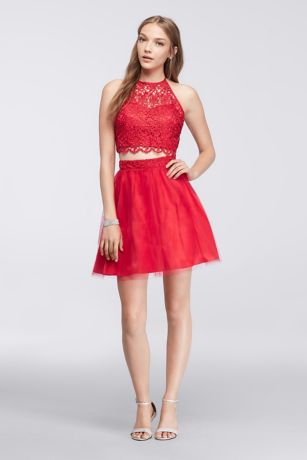 We adore the way the scalloped trim on this halter lace crop top coordinates with the lace banding on the full tulle skirt.