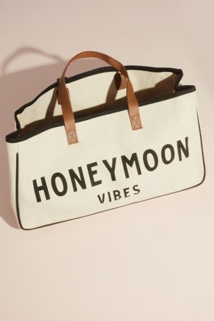 Whether you're beach bound, site seeing, or laying low, this convenient "Honeymoon Vibes" open-top canvas duffle will come in handy on your post-nuptials trip.