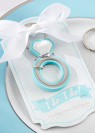 Celebrate that bling with a meaningful key ring! Diamonds may be a girl's best friend, but a key ring helps guests go where they want to go every day--this one has a stand-out color combo and 3D details! Bright-blue and gray rubber engagement ring with a white-rubber, 3D "diamond", metal chain and key ring.