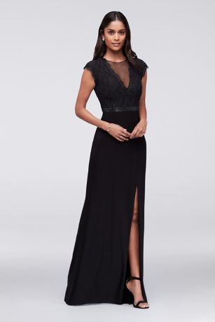 This lace-bodice dress features a deep illusion V-neck and a keyhole back, while a slit jersey skirt shows off a bit of leg.