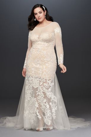 Anything but ordinary, this sultry sheath wedding dress features ornately beaded scrolling lace appliques atop long illusion sleeves and a dramatic sweetheart neckline. The transparent skirt, finished with tulle godets, shows off the champagne-hued, knee-length lining, crafted of body-skimming, power mesh for a sleek fit.