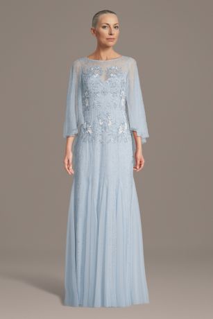 A sleek sheath dress for mothers of the bride and groom featuring an illusion beaded bodice and softly draped sleeves. Designed to shimmer with every move, it delivers an elegant look made for the spotlight.