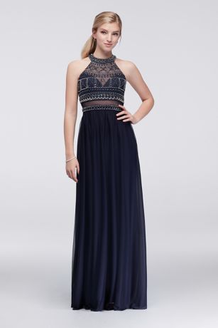 Geometric beads create an angular pattern on the illusion bodice of this matte jersey dress, while a mesh-inset waistline mimics the look of a two-piece ensemble.