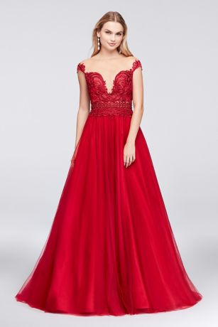 This tulle ball gown's lace bodice looks barely there, thanks to sheer illusion mesh that makes the cap sleeves, plunging sweetheart neckline, and open back seem to defy gravity. Tonal crystals and pearls add the perfect amount of detail.