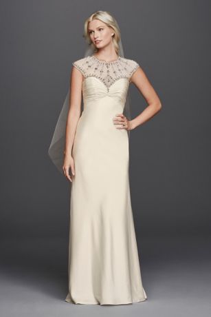 This matte charmeuse, a-line gown is a beauty! Featuring a sweetheart neckline, jeweled illusion yoke and cap sleeves it's the perfect wedding dress for a traditional wedding with a trendy twist.
