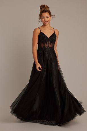 The A-line silhouette is classic. The illusion bodice is unexpected. The lace appliques make this tulle dress next-level.