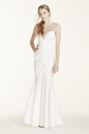 - Illusion tank sweetheart bodice adorned with brilliant crystal accents at the neckline for an ultra-glam look.