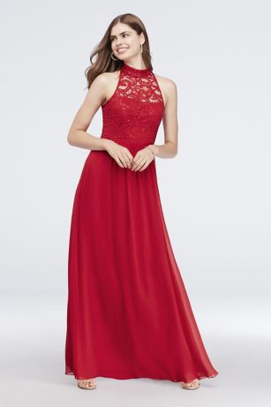 A high neck and soft A-line shape make this sequined illusion lace and chiffon gown an easy-to-dance-in choice for prom.