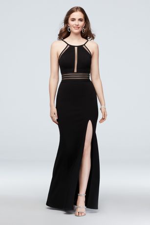 Turn your party into a red carpet-worthy celebration in this eye-catching mermaid gown. Illusion mesh outlines a halter neckline, keyhole bodice, and banded waist, creating a figure-accentuating, show-stopping look.