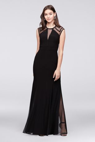 Add a little va-va-voom to your look with this curve-hugging jersey mermaid dress. The illusion bodice is finished with sleek trim and a keyhole back, while the mermaid skirt is inset with mesh for flowing movement.